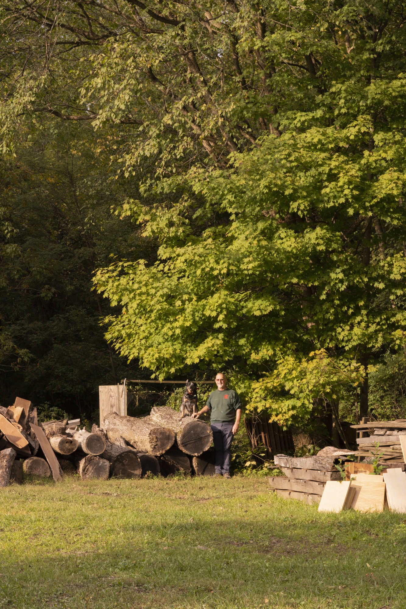 Phil Ping and his dog, Bandit, of Loveland, Ohio, with his logs and boards of maple, oak, walnut and pine. Ping has been a full-time woodworker for 35 years and has lived in his home for the same amount of time. The wood in the foreground are boards and slabs he cut from the logs that now have to air dry for one year per one-inch thickness before Ping will make them into tables, benches, shelves and more.